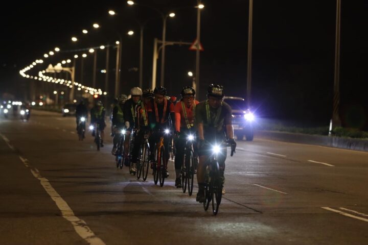 I must say, we were blessed with the best weather conditions this year. A very strong tailwind propelled us, and everyone was cruising at over 40 km/hour, making the ride exceptionally enjoyable. Soon, I recognized my friends Jeff and Hsunyi, along with their friend Abby, all identified by Xiaochu’s glowing bands as participants in the support services. Realising our paces were quite similar, we decided to stick together and took turns leading the group.